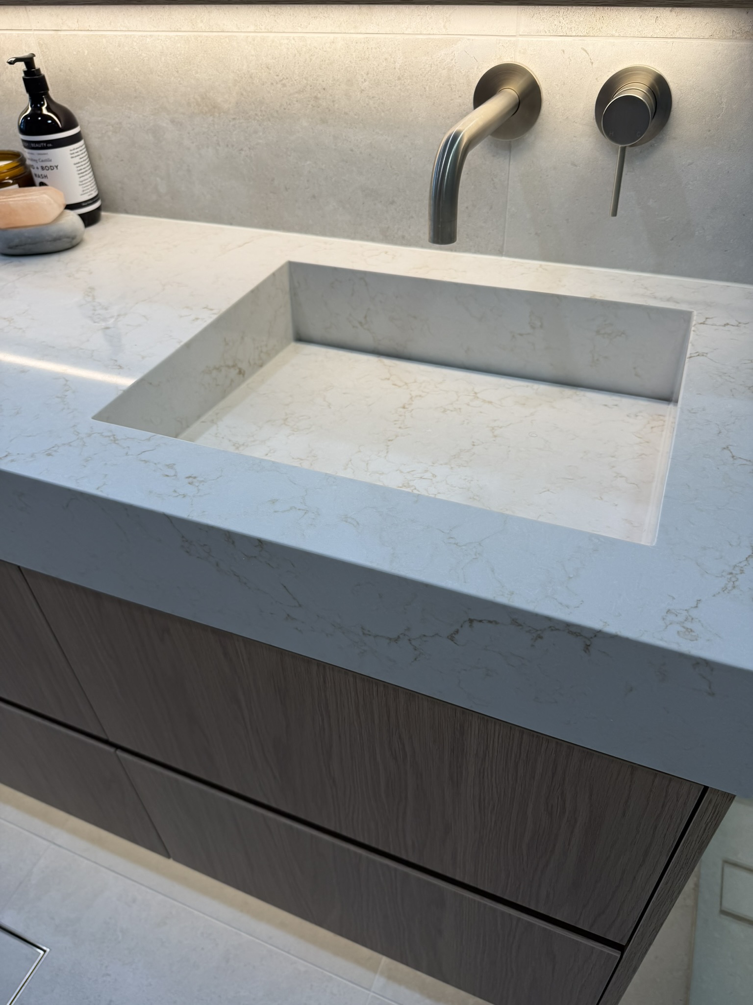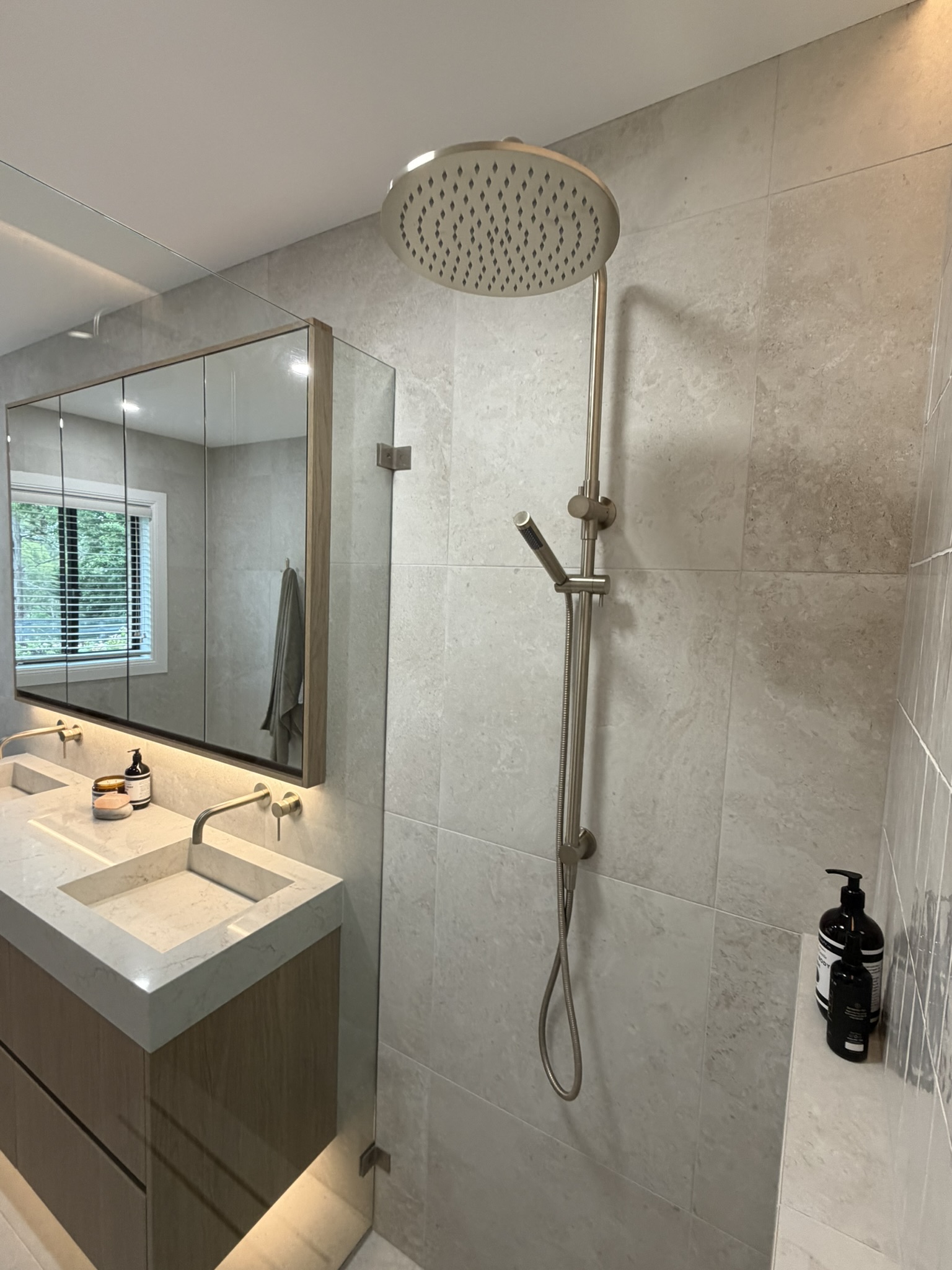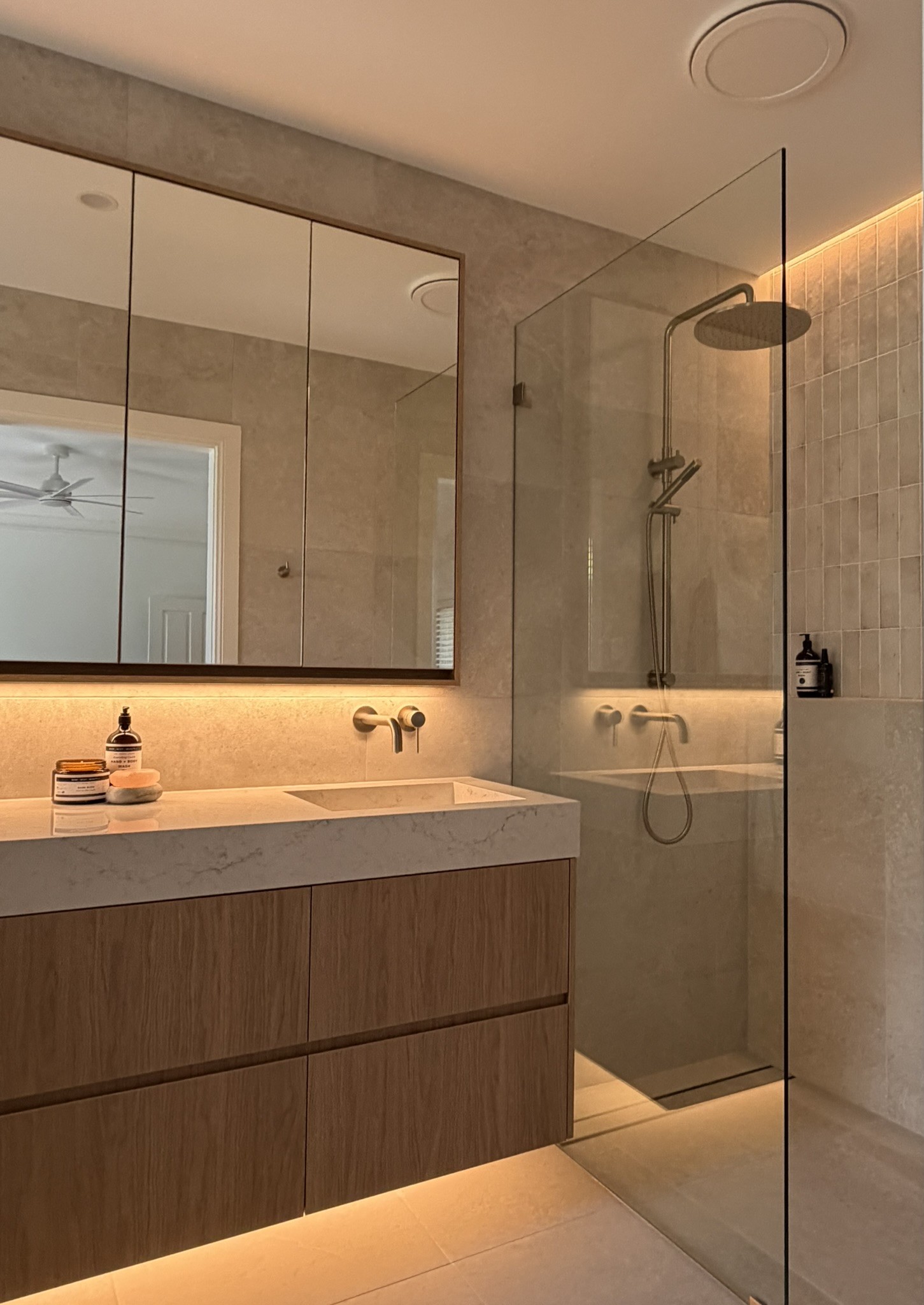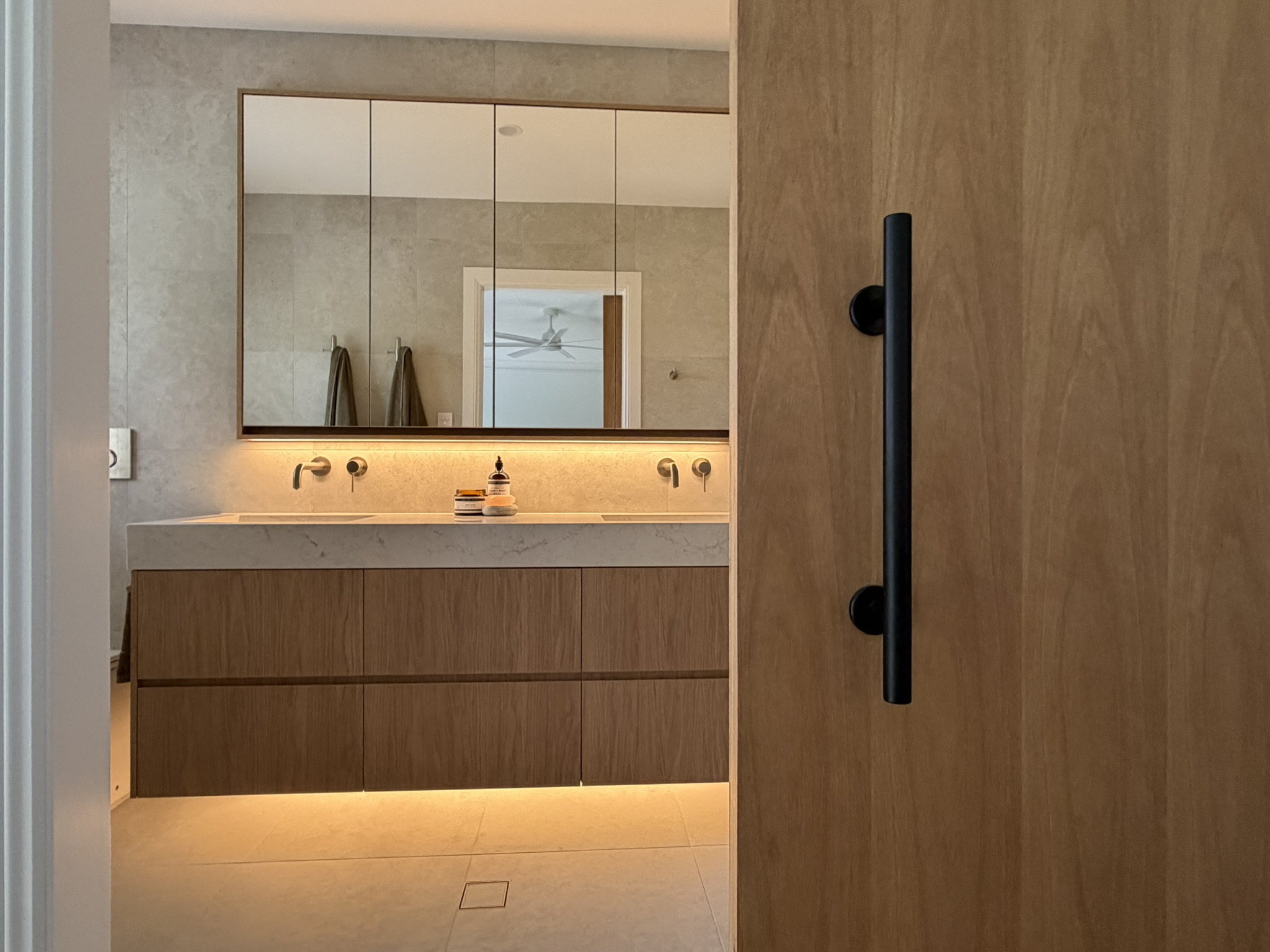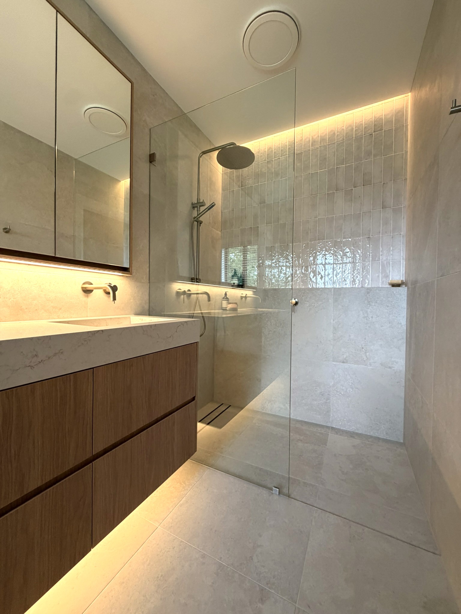 The vanity became the centrepiece — not just visually, but functionally. Every dimension was thoughtfully planned to maximise storage, ease of use, and cleaning. The recessed shaving cabinet was designed higher and deeper than standard, taking full advantage of the ceiling height to utilise every possible centimetre.