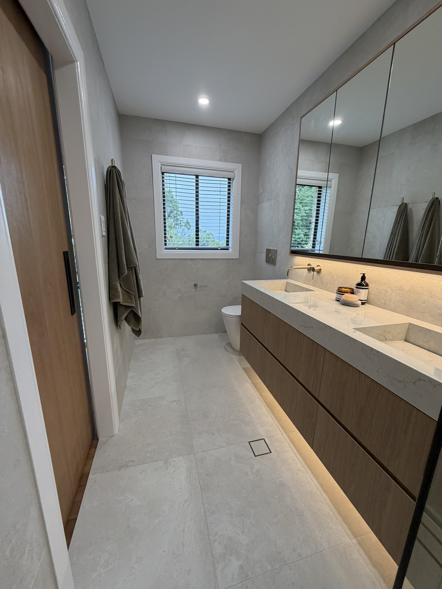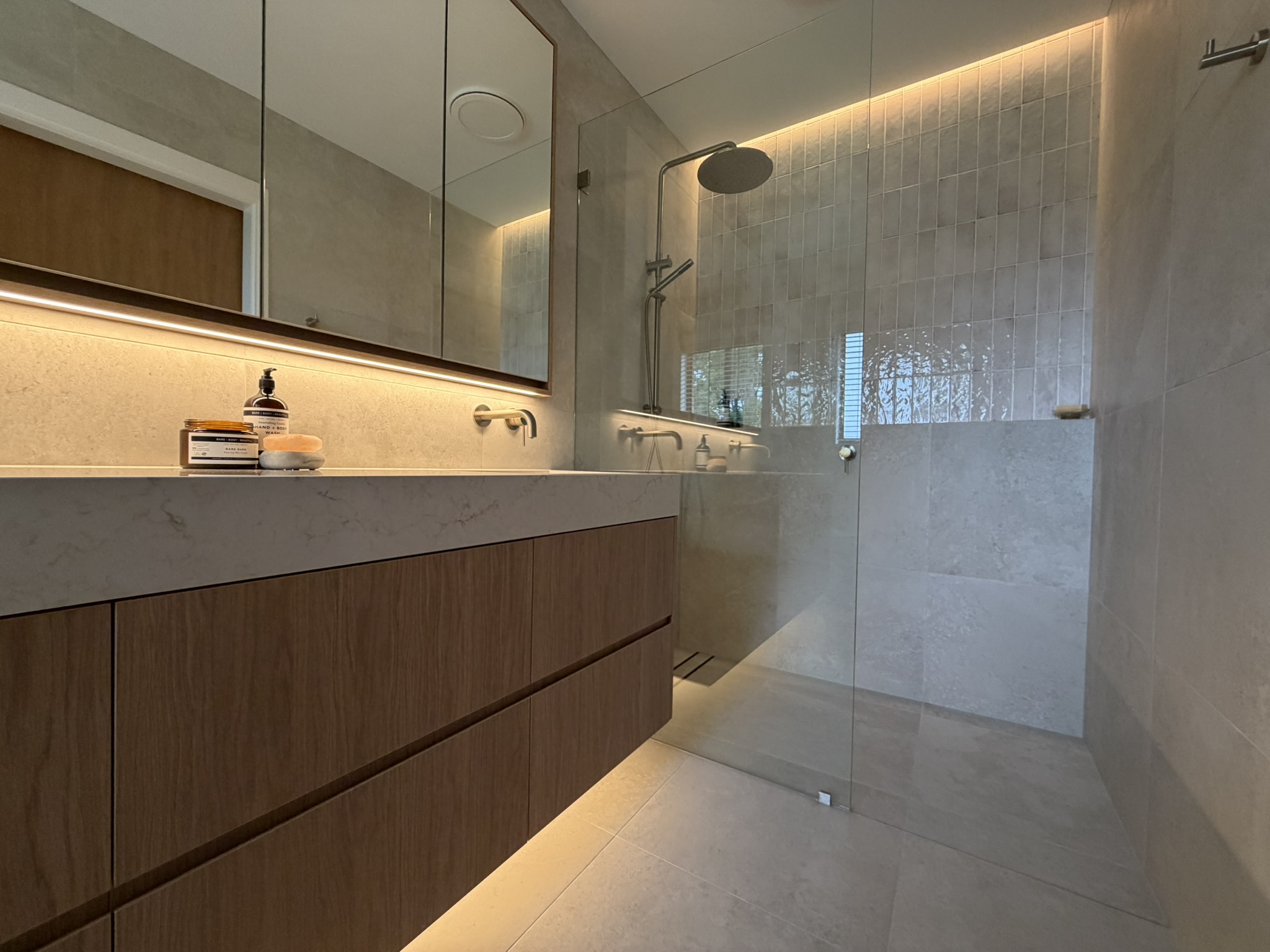 We prioritised smart storage solutions, introduced a custom oversized vanity and shaving cabinet, and layered in materials and lighting to create a warm, inviting atmosphere. Behind the scenes, we addressed the original cause of failure — installing a proper copper shower tray and ensuring the space was built to perform long-term.