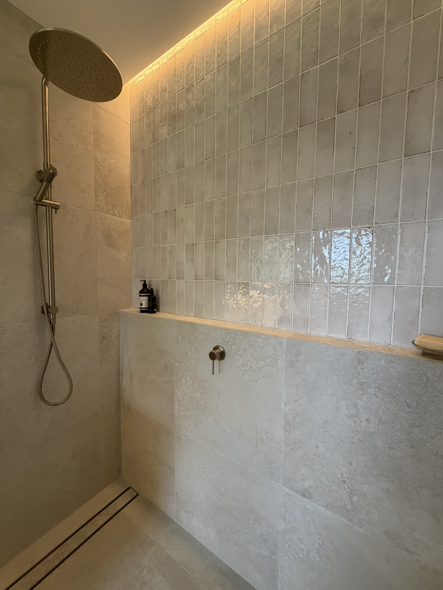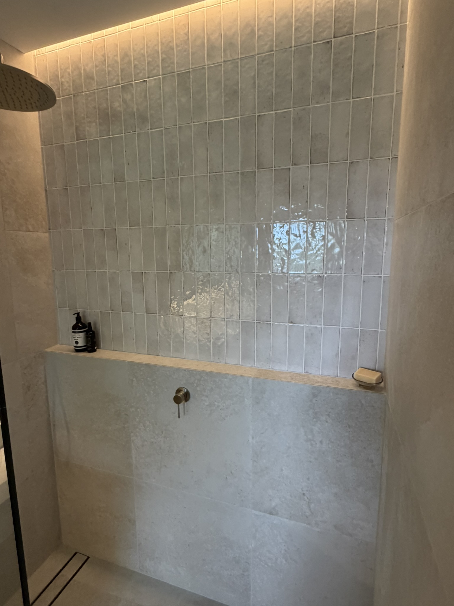 - Recessed ceiling detail above shower with concealed LED strip lighting to softly illuminate feature tiles