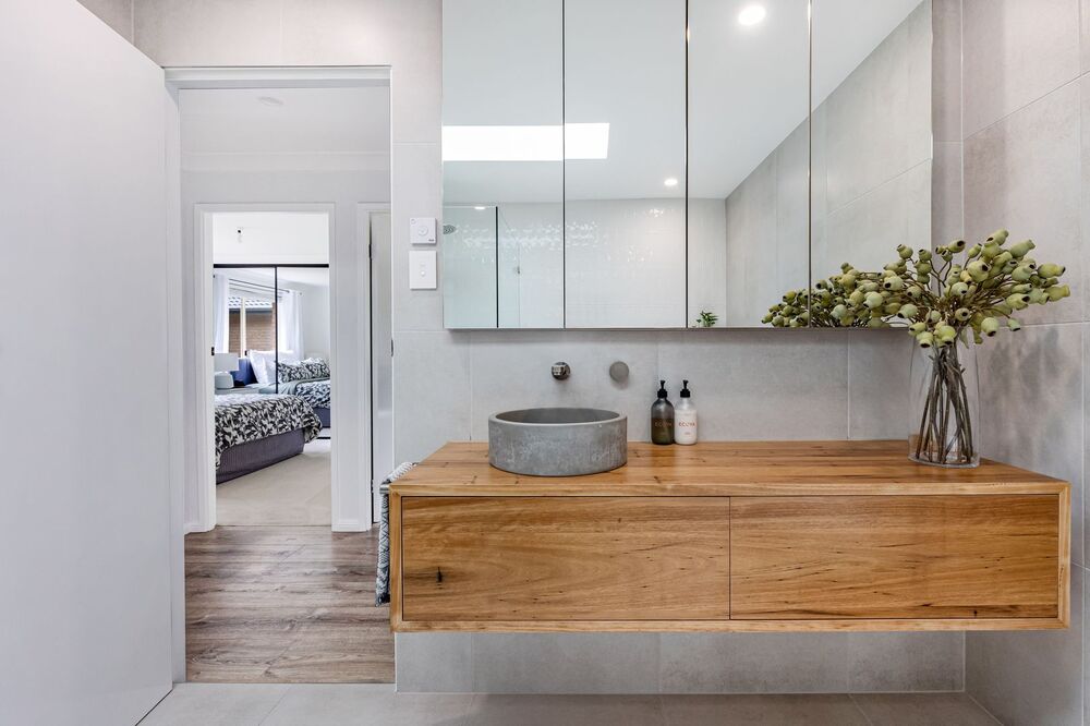 The bathroom also features a large wooden wall-hung vanity topped with an above-counter stone basin. This combination brings a natural warmth and sophistication to the space. The wall-hung design of the vanity not only provides a modern aesthetic but also maximises floor space, making the bathroom feel larger and more open.