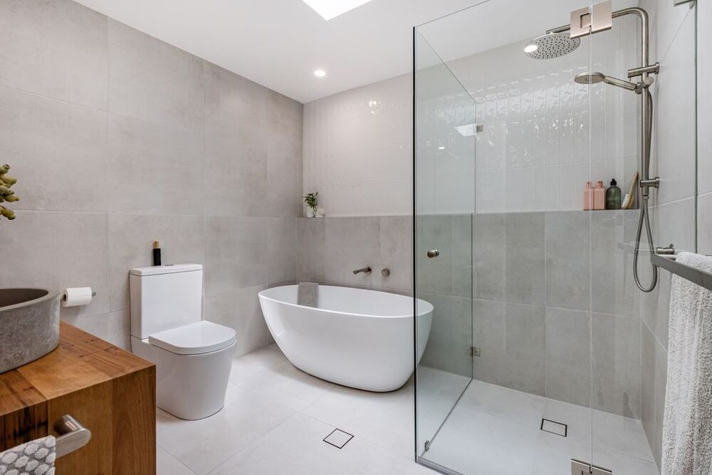 A centrepiece of this renovation is the large, sleek freestanding bath with an adjacent wall ledge. The freestanding design offers a luxurious and spa-like bathing experience, while the wall ledge provides practical storage for bath essentials, keeping them within easy reach without compromising the clean, open feel of the space. This setup enhances the bathroom’s overall aesthetic, making it a perfect spot for relaxation.